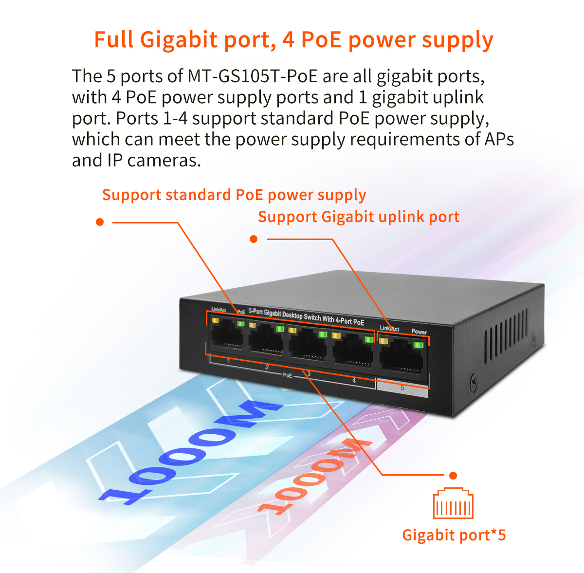 5 *10/100/1000Mbps adaptive Ethernet port, support Auto MDI/MDIX;